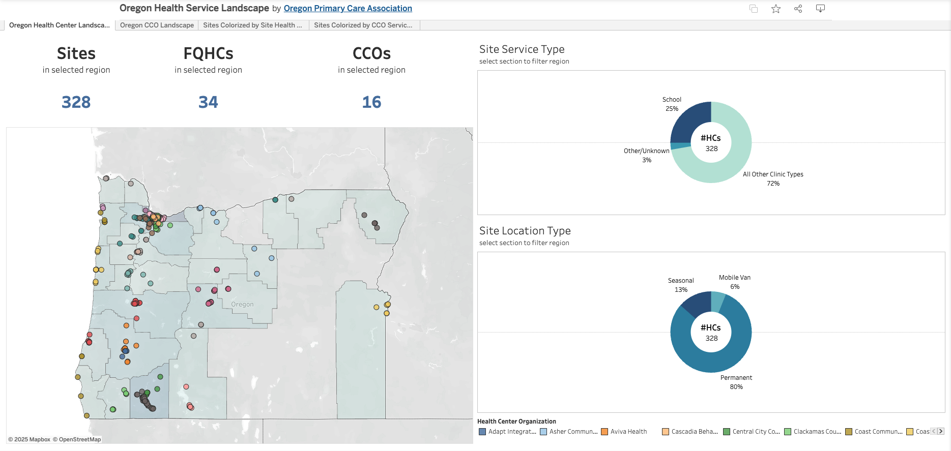 An interactive dashboard visualizing health center service delivery sites across Oregon.