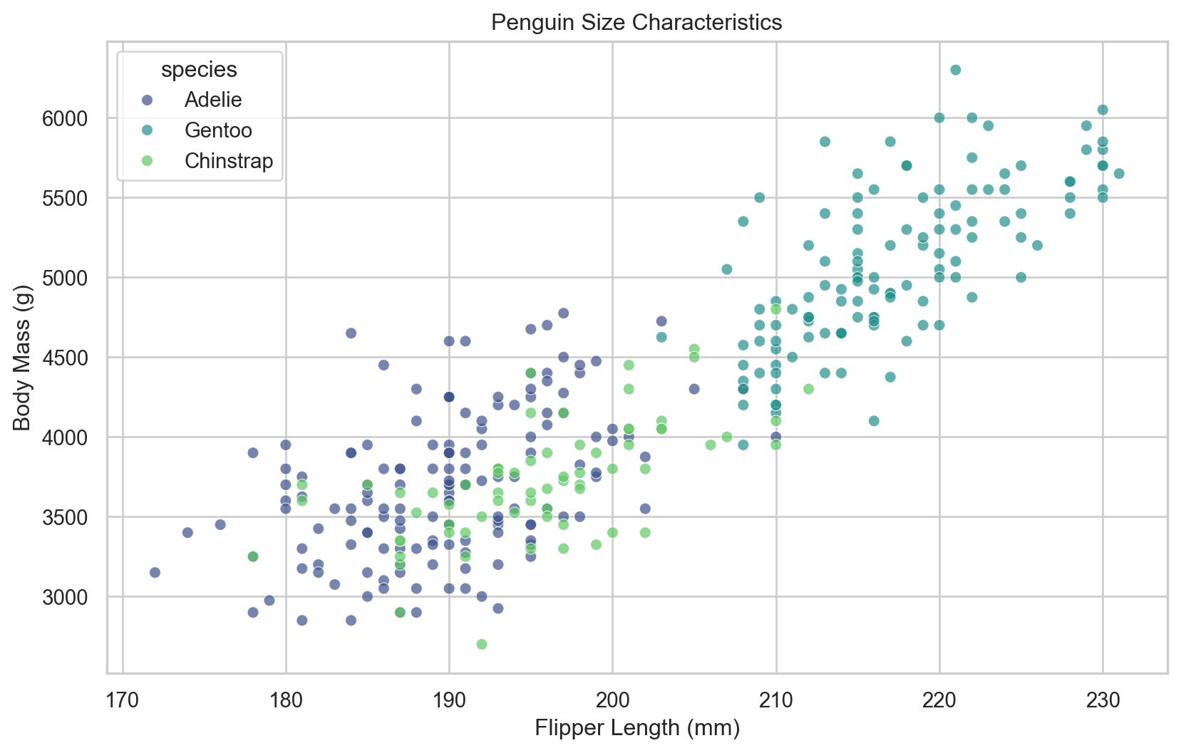 # Set a nice themesns.set_theme(style="whitegrid")# Create the plotplt.figure(figsize=(10, 6))plot = sns.scatterplot( data=penguins, x="flipper_length_mm", y="body_mass_g", hue="species", palette="viridis", alpha=0.7)plt.title("Penguin Size Characteristics")plt.xlabel("Flipper Length (mm)")plt.ylabel("Body Mass (g)")# Save the thumbnail for the galleryplt.savefig("penguin_plot.png")# Show the plotplt.show()